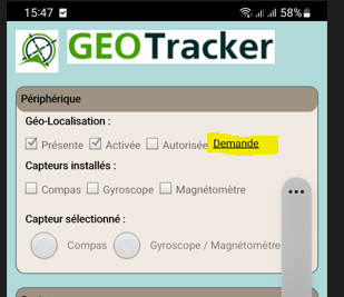 Capteurs installés : Indique si le compas, le gyroscope et le magnétomètre sont présents sur le mobile. Ces capteurs sont utiles pour la fonction d’orientation vers une position, qui permet d’afficher une boussole de guidage vers un point (voir plus bas).