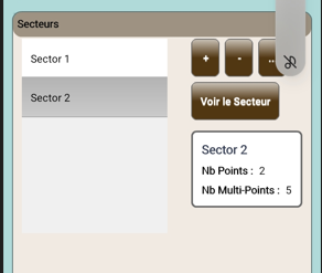 La première chose à faire dans Geo-Tracker est de créer un nouveau secteur en cliquant sur le bouton + . Le bouton – sert à supprimer un secteur déjà créé. Le bouton … sert à modifier le nom d’un secteur.