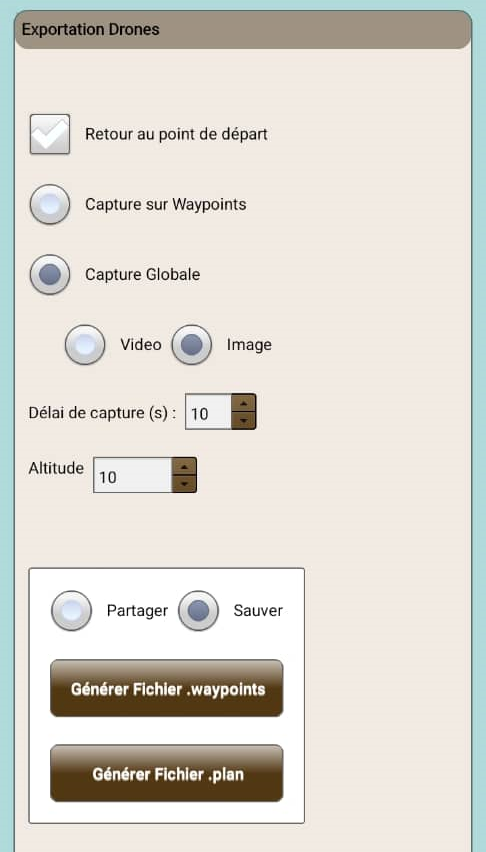 Puis on peut générer le fichier de mission sous 2 formats possibles : le format .waypoints ou le format .plan. On peut soit les sauvegarder, soit utiliser les fonctions de partage du smartphone.