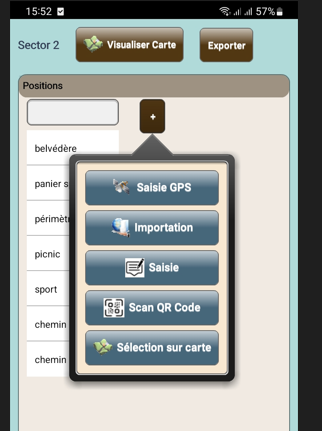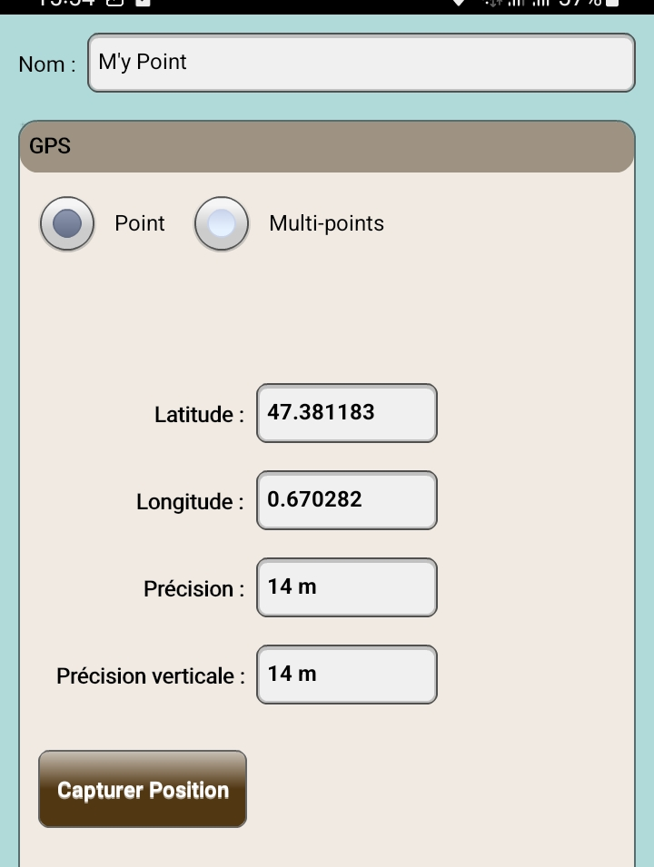 Si vous avez choisi un Point, Cliquez sur Capturer Position pour effectuer un relevé GPS sur votre position. Elle est directement enregistrée dans le Secteur en cours.