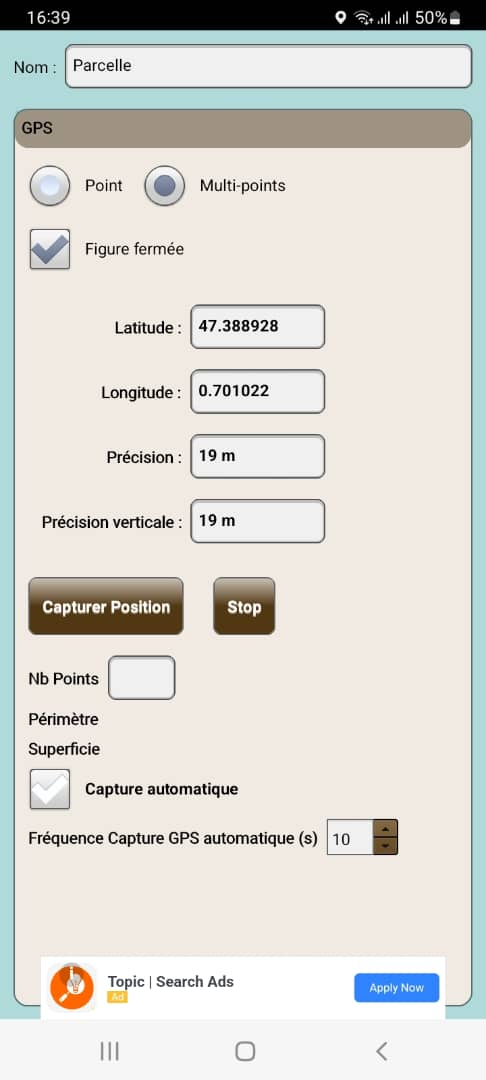 A chaque clic sur le bouton Capturer Position, le compteur des relevés s’incrémente (champ « Nb ») et la distance cumulée s’affiche à partir du deuxième relevé. Si vous avez choisi une figure fermée, la superficie s’affiche en plus.