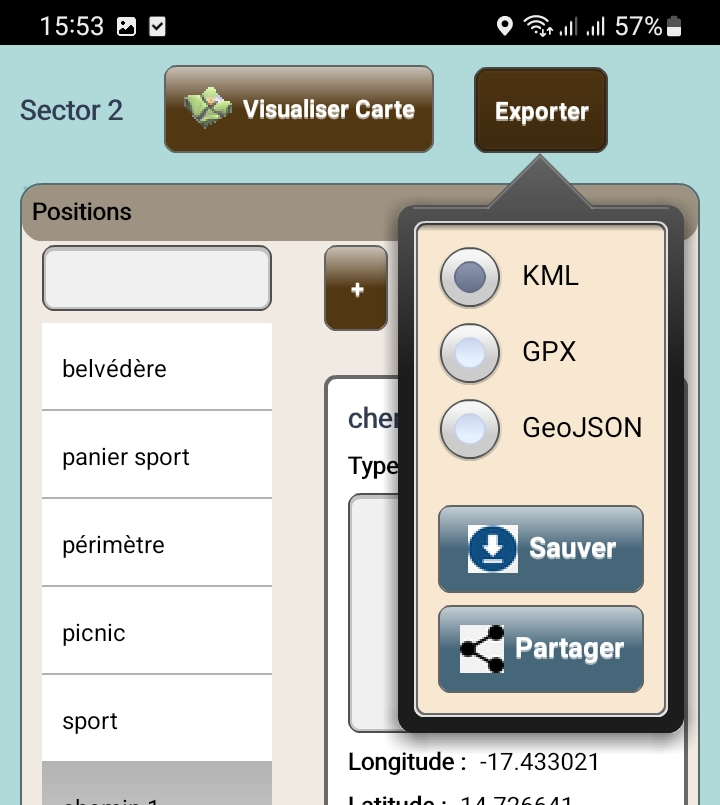 Les objets d’un secteur peuvent être exportés au format KML, GPX ou GeoJSON. Et ceci, de deux manières différentes : soit en sauvant le fichier sur le smartphone, soit en le partageant avec les fonctions de partage intégrées.
