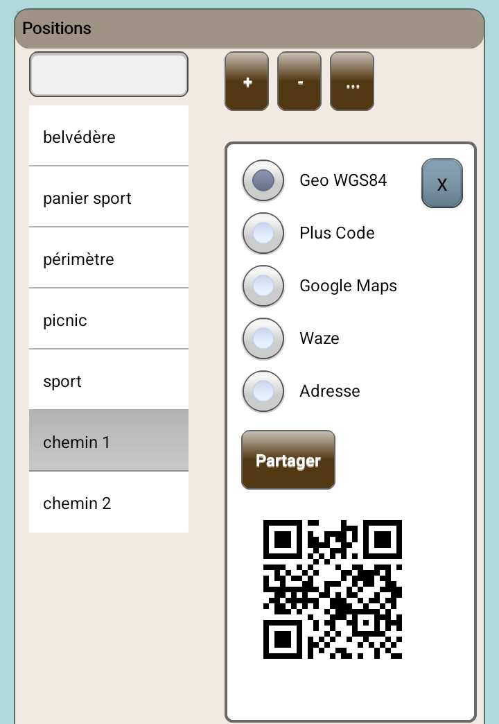 En cliquant sur QR Code, il est possible de générer un QR Code relatif à la position et de le partager. Ce QR Code peut être au format Geo WGS84 (coordonnées GPS simples), Plus Code, Google Maps, Waze, ou bien adresse textuelle.