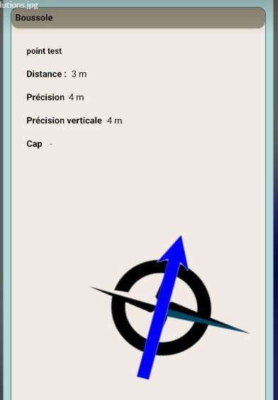 Cette fonction permet de s’orienter sur le terrain, même sans connexion internet. Vous obtenez une boussole sur laquelle est superposée une flèche bleue indiquant la direction à suivre pour atteindre la position sélectionnée, avec distance qui vous en sépare.
